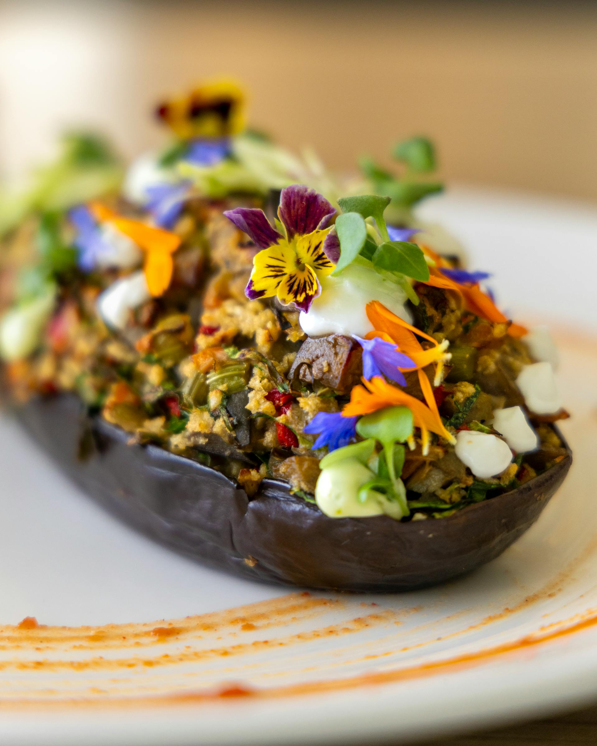Patlidžane poređajte u vatrostalnu posudu. Svaku polovinu napunite pripremljenim nadevom. Po vrhu možete dodati još malo maslinovog ulja i po želji nekoliko kolutova paradajza.